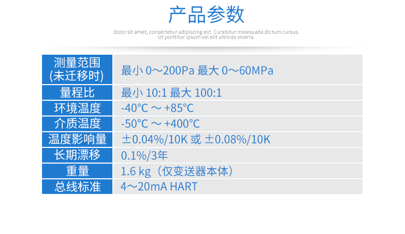產(chǎn)品描述:智能差壓變送器是用世界先進(jìn)的單晶硅壓力傳感器技術(shù)與專利封裝工藝,精心研制出的一款國(guó)際領(lǐng)先技術(shù)的高性能壓力變送器。
