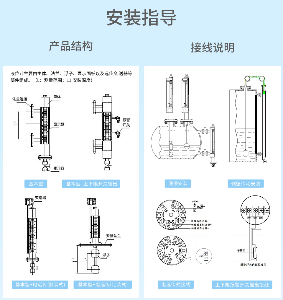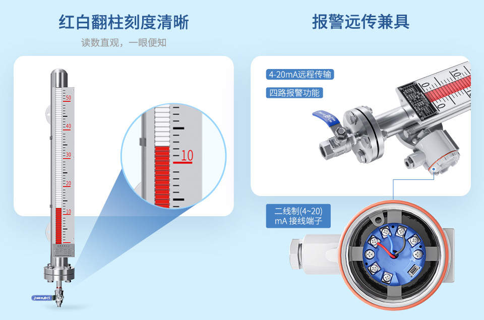 產品描述:磁翻板液位計用于測量有壓容器或開口容器內液體的液位。本產品不僅可就地指示,配上液位控制開關、報警開關,可實現液位的控制、報警和連鎖,配上內置式一體化液位變送器,可將液位(界面)信號轉換成二線制(4~20)mA 標準信號,實現液位遠距離檢測和控制。可廣泛應用于石油加工、市政、食品加工、化工、水處理、制藥、電力、造紙、冶金、船舶和鍋爐等領域。